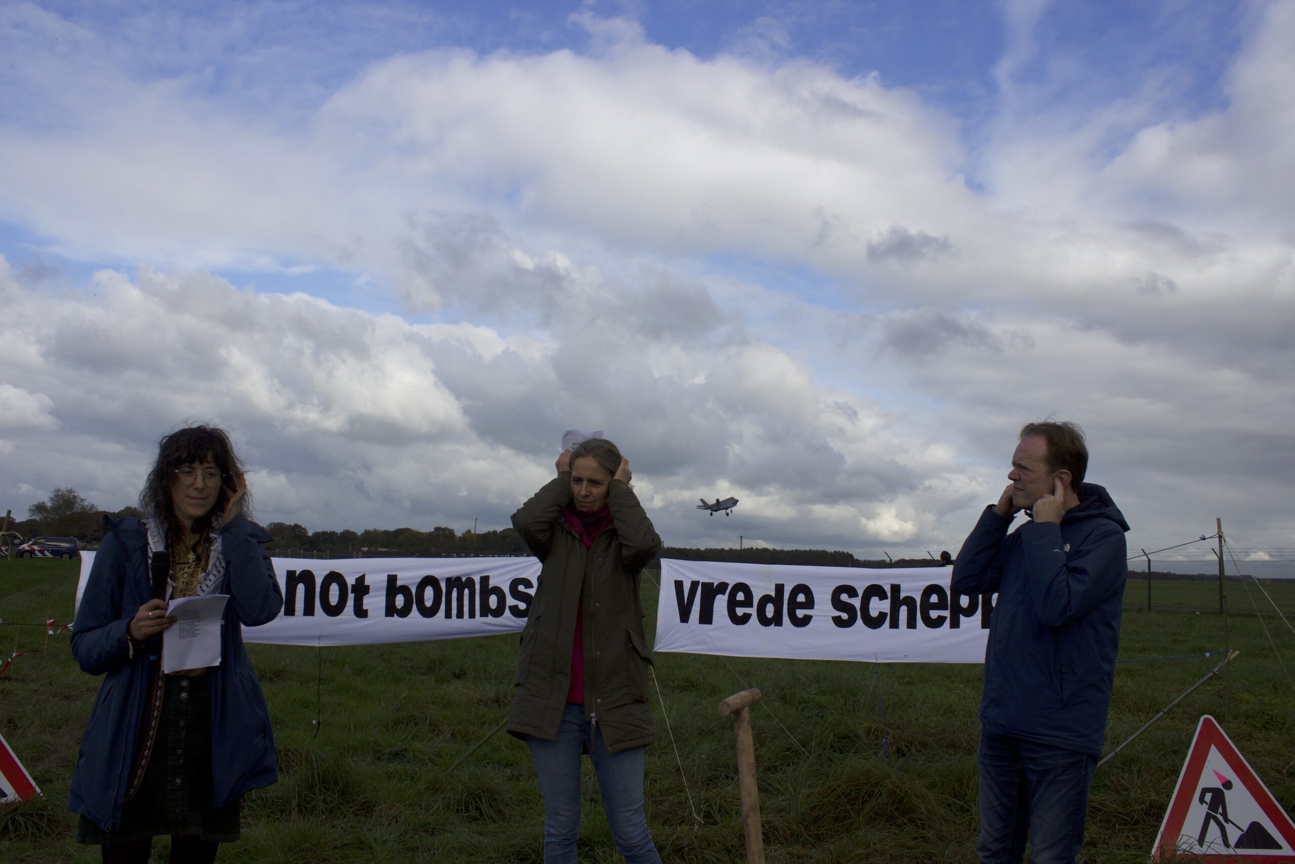 Daarna gingen we een tunneltje onder het hek door graven met de intentie om op de startbaan te zitten en het gebulder STIL te leggen. Vijf vredes scheppers werden aangehouden. Het oorverdovende gedender boven ons gaat nog even door, maar het zal niet voor eeuwig zijn. Als de boompjes later groot zijn en er naast de basis een gemengd bos groeit, kunnen de gevechtsvliegtuigen niet meer opstijgen of landen. Dan smeden wij onze zwaarden tot ploegscharen en zorgen voor de bomen zoals zij voor ons zorgden.
